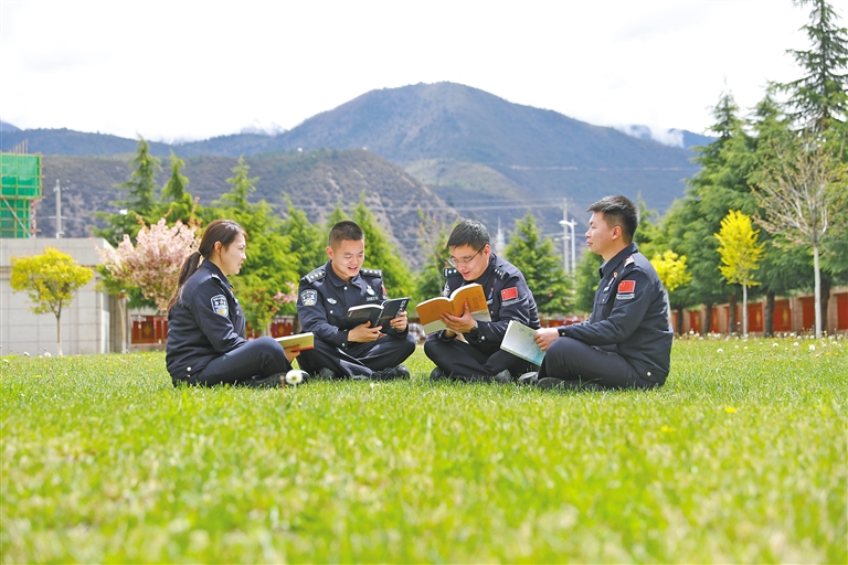 圖為林芝邊境管理支隊機關民警圍坐在一起讀書。 記者 彭琦 通訊員 張力 攝