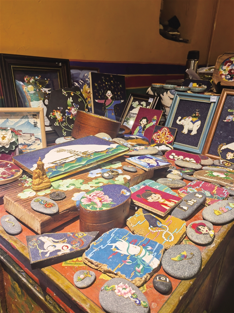 暮色溫柔地漫入八廓街,游客的喧鬧漸次平息。南吉合多杰捻亮案頭那盞溫暖的工作燈。光暈籠罩著他微微前傾的身影,也籠罩著木板上那幅還沒完成的《岡仁波齊》——金屬絲在柔光下靜靜閃爍,細若游絲,卻透著一股韌勁。這門以銅絲為筆、釉彩為墨的手藝,于方寸木板上,在金屬與礦粉的交織中,正安靜地續寫著自己的故事——微小如塵埃,卻磅礴如永恒。
