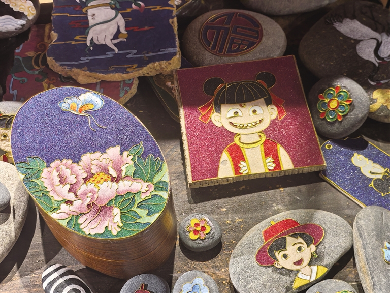他拿起一枚掌心大小的石頭,銅絲在其上掐出精細的花朵輪廓,釉彩點染著柔和的藍與綠,小巧玲瓏卻意趣盎然。這些作品是可以置于案頭、握在掌心、贈予友人的美好物件,承載著祝福、回憶或單純的喜愛。