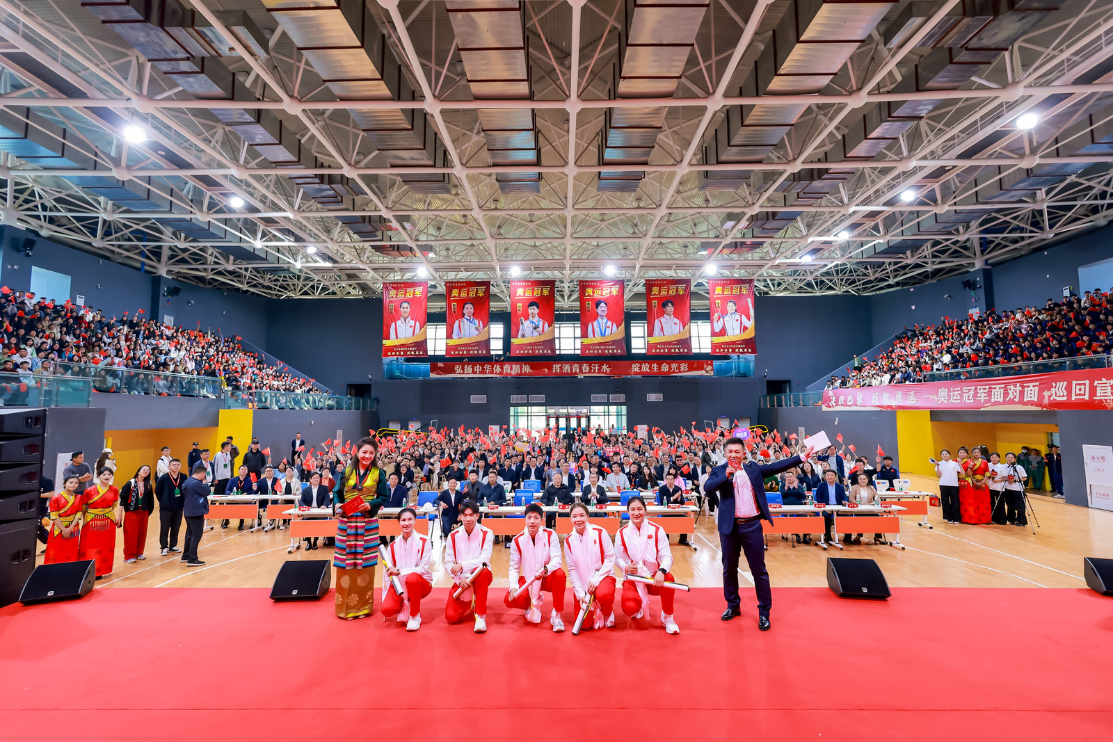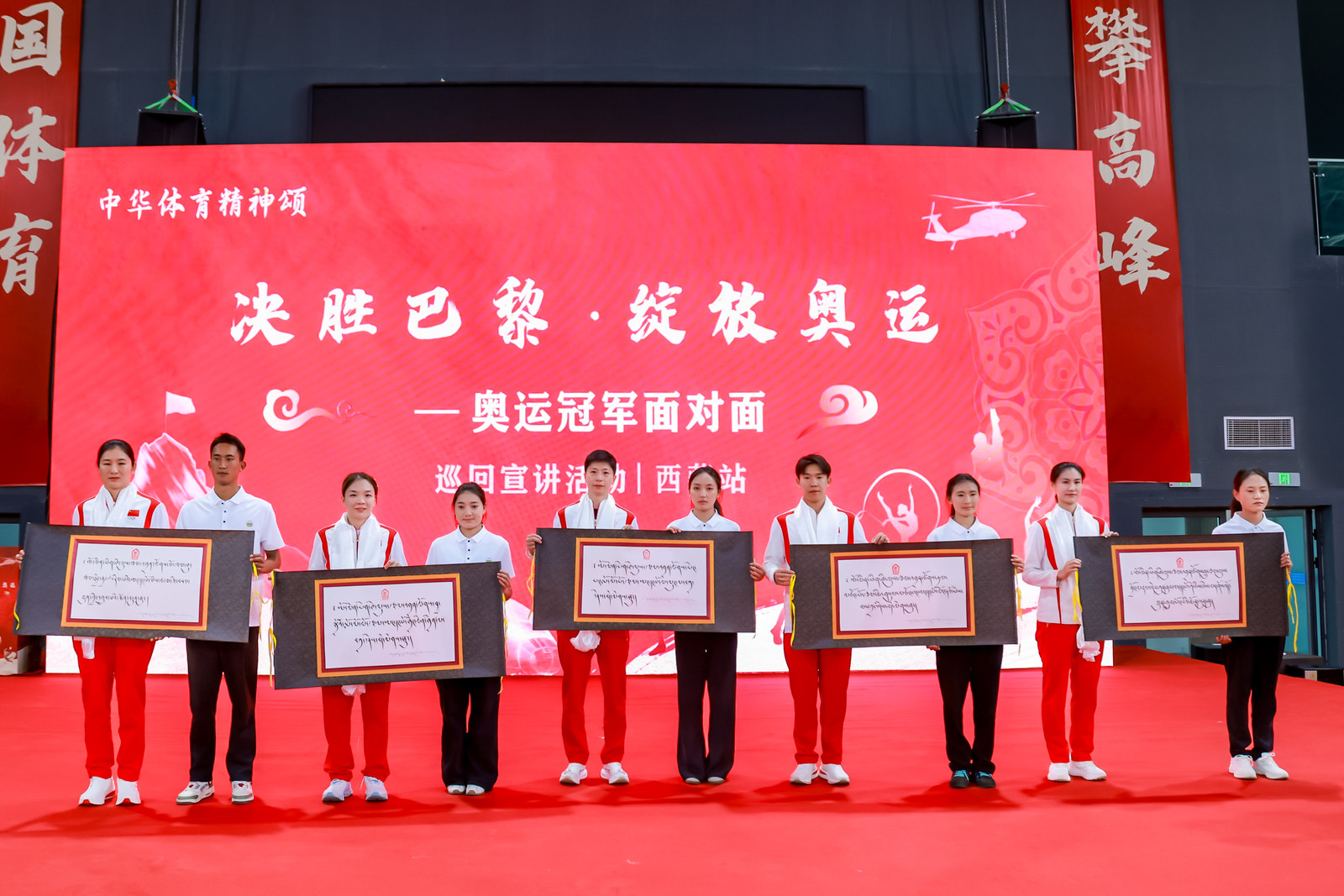 體育館內則坐滿了藏醫大的學生,他們揮舞著手中的五星紅旗,用最熱情的歡呼迎接冠軍們的到來。在藏醫大和國家體育總局的領導致辭結束后,大家一同觀看了文藝表演和奧運冠軍們的奪牌時刻視頻。在運動員宣講環節,陳清晨、郭崎琪和李倩三位冠軍依次登臺,用真摯的語言結合自身奮斗經歷,分享了她們在奪冠路上的故事。
