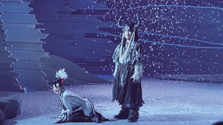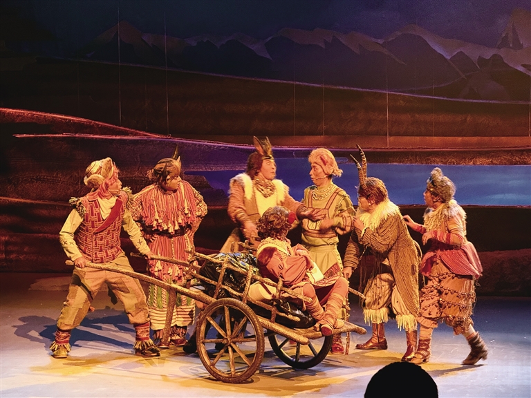 在《高原上的精靈》舞臺上,西藏傳統(tǒng)樂器的韻律與生態(tài)寓言相互交織。當(dāng)弦子、鷹笛和扎念琴的聲音劃破夜空時,小觀眾們已沉浸其中。藏戲溫巴的藍(lán)面具在聚光燈下浮現(xiàn),藏戲特有的說唱調(diào)式如雪山融水般流淌……《高原上的精靈》以80分鐘的音樂劇形式突破傳統(tǒng)話劇的敘事框架,這種形式選擇源于深刻的兒童心理洞察——音樂劇特有的歌舞敘事能持續(xù)刺激視覺與聽覺神經(jīng),避免低齡觀眾對純對白場景產(chǎn)生倦怠感。