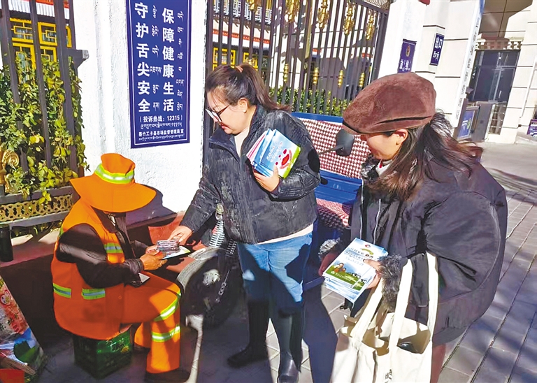 墨竹工卡縣群團工作部婦聯工作人員向環衛工人發放反家庭暴力宣傳手冊。