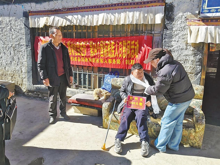 圖為措美縣殘聯工作人員為身患殘疾的村民送去慰問金及生活用品。記者 武沛濤 通訊員 旦珠 攝