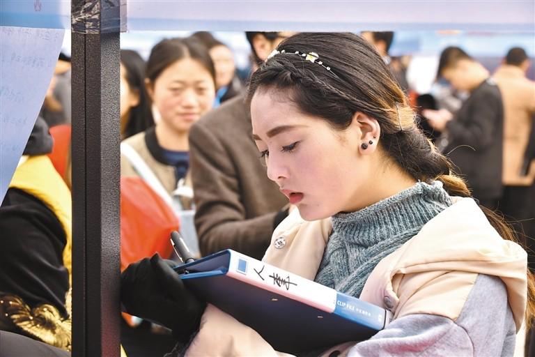 求職者在人力資源洽談會現場填寫材料。