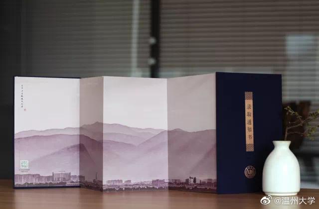 今年溫州大學的錄取通知書,以瑞安市東源村的國家級非物質文化遺產木活字印刷技藝為創意點,深藍色的燙金布藝封面配上“木活字”印刷的錄取證書、校長寄語、校歌,內頁背面則是以溫州地理標志大羅山為底、溫大建筑為前景的山水畫卷。第一批錄取通知書將于8月20日前后寄出。