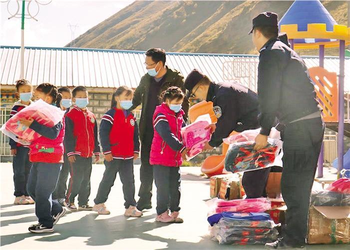 圖為康布邊境派出所民警向轄區困難學生發放新書包。通訊員 張猛 記者 張宇 攝