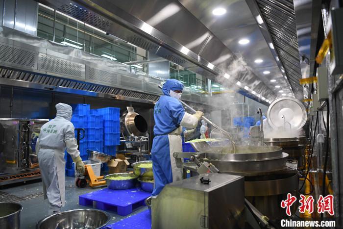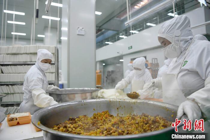 圖為3月11日,西藏自治區拉薩市城關區凈土拉薩中央廚房配餐車間內,工作人員正在為學生集中配餐。 中新社記者 貢嘎來松 攝
