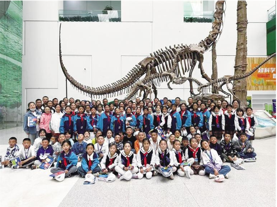 中國科技館展覽教育中心主任齊欣介紹:“我們中國科技館的教育理念是體驗科學(xué),體驗創(chuàng)新。這次特別針對西藏的小學(xué)生、初中生和高中生精心準(zhǔn)備了對應(yīng)課標(biāo),對應(yīng)孩子們應(yīng)該掌握的這些知識點,依托中國科技館常設(shè)的展覽展品里涉及到的相關(guān)知識進(jìn)行連接和對接。特意開發(fā)了不同年級的一些學(xué)習(xí)任務(wù)單,孩子們拿著這些任務(wù)單走進(jìn)我們的展廳,親自去體驗和探索這些展品,再結(jié)合任務(wù)單上問題去思考,形成孩子們自己對某些知識、某些現(xiàn)象、某些問題的認(rèn)識和直接經(jīng)驗,這樣的學(xué)習(xí)方式比單純看書本去學(xué)習(xí)來得更真實,更有自己的切身的體會。在孩子們走出科技館以后,還能夠?qū)@些領(lǐng)域、這些知識抱有很高的好奇心,然后自己再通過查閱資料,問老師、參加拓展延伸知識資源儲備,進(jìn)一步深入地學(xué)習(xí)和探索。” 同學(xué)們在中國科技館合影。