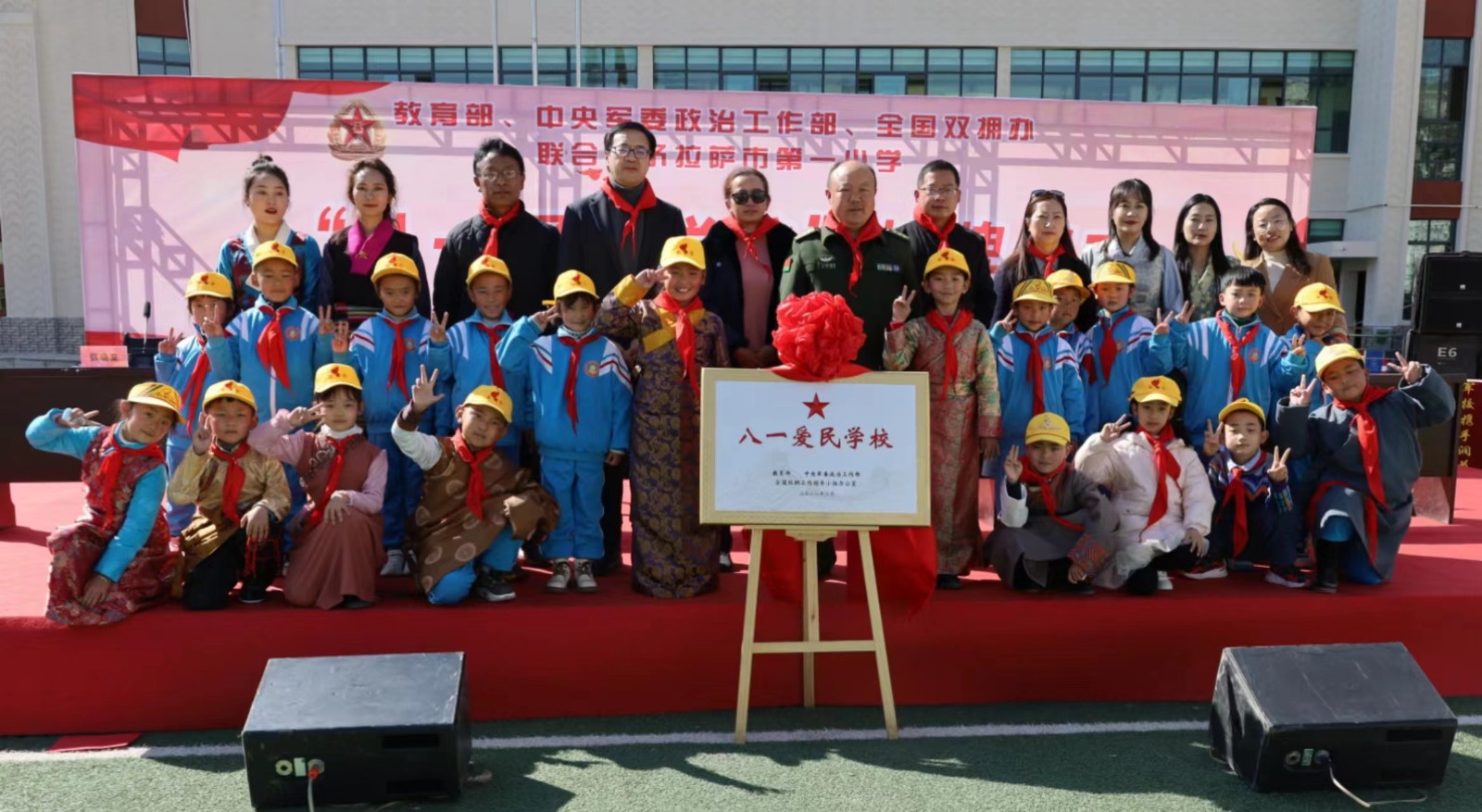 在全校師生熱烈的掌聲中,王會忠與拉薩市第一小學校長陳文博共同為“八一愛民學校”揭牌。儀式上,陳文博表示,此次授牌儀式既是傳承紅色基因、加強國防教育、厚植青少年學生愛黨愛國愛軍思想根基的生動實踐,也是軍地融合共同提高學校辦學特色水平和扶持地方教育發展的重要舉措。