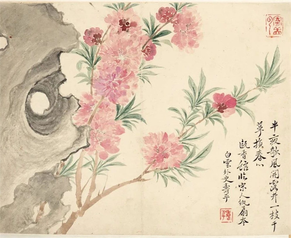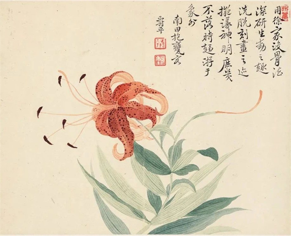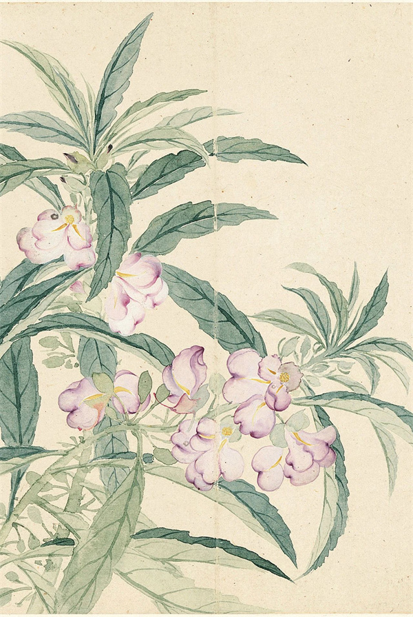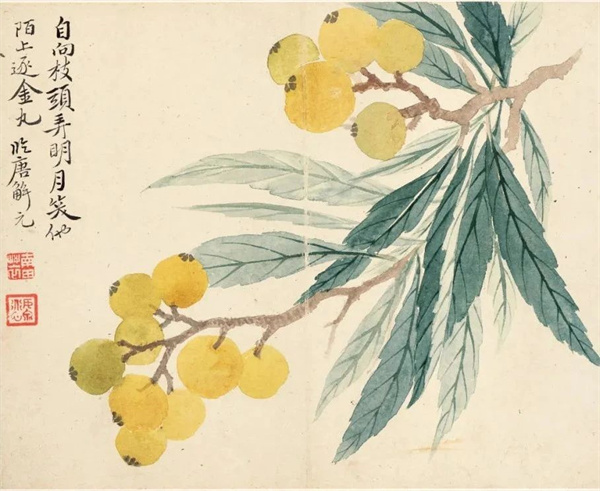 惲壽平的《甌香館寫生冊》,天津博物館藏,描寫了四時的花果。從春夏到秋冬分別是桃花、海棠、碧海珊瑚、牡丹、枇杷、卷丹、洛陽花、鳳仙花、菊花、梅花。作品用筆清勁秀逸,而不見筆墨痕跡,設色醇厚鮮麗,清新古雅,令人眼目一新。
