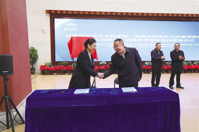 為推動我區“大思政課”工作格局的構建,進一步增強其實踐育人效果,西藏博物館于12月11日與拉薩師范高等專科學校、西藏技師學院共同舉行了共建“大思政課”實踐教學基地的簽約授牌儀式,儀式由西藏博物館黨委書記拉巴次仁主持。