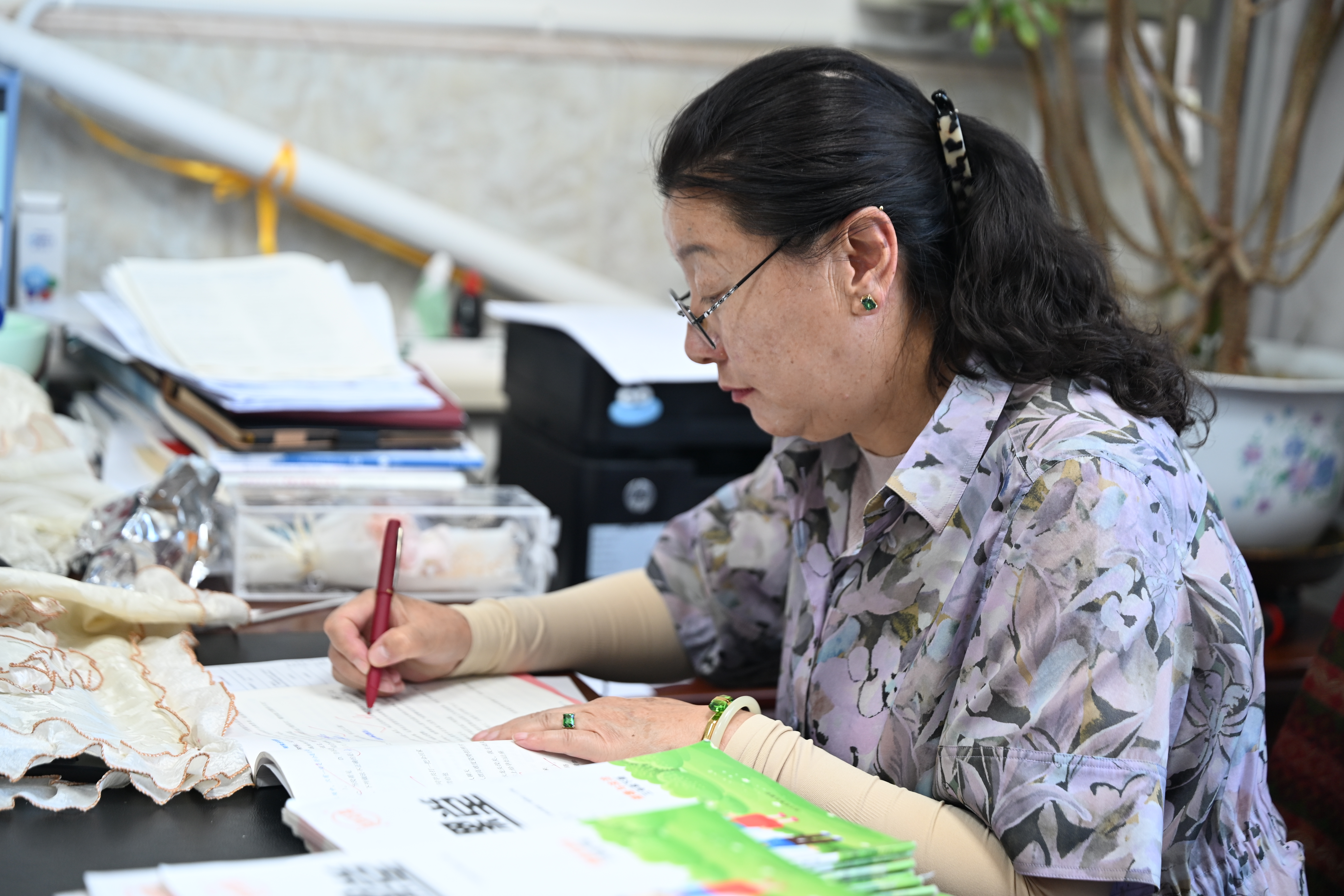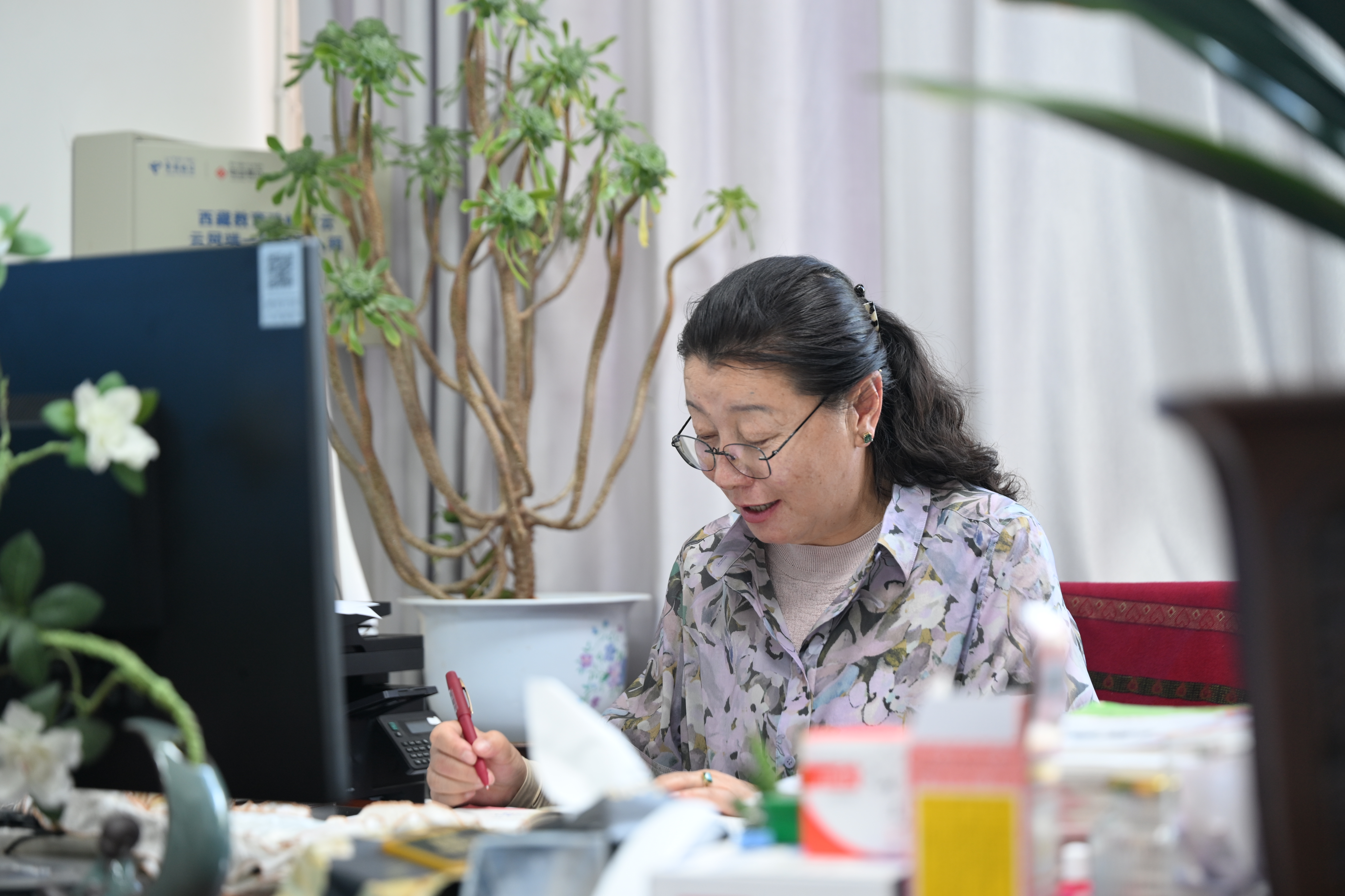 拉薩市第一小學本部執行副校長次仁拉姆老師在辦公室認真修改學生作業