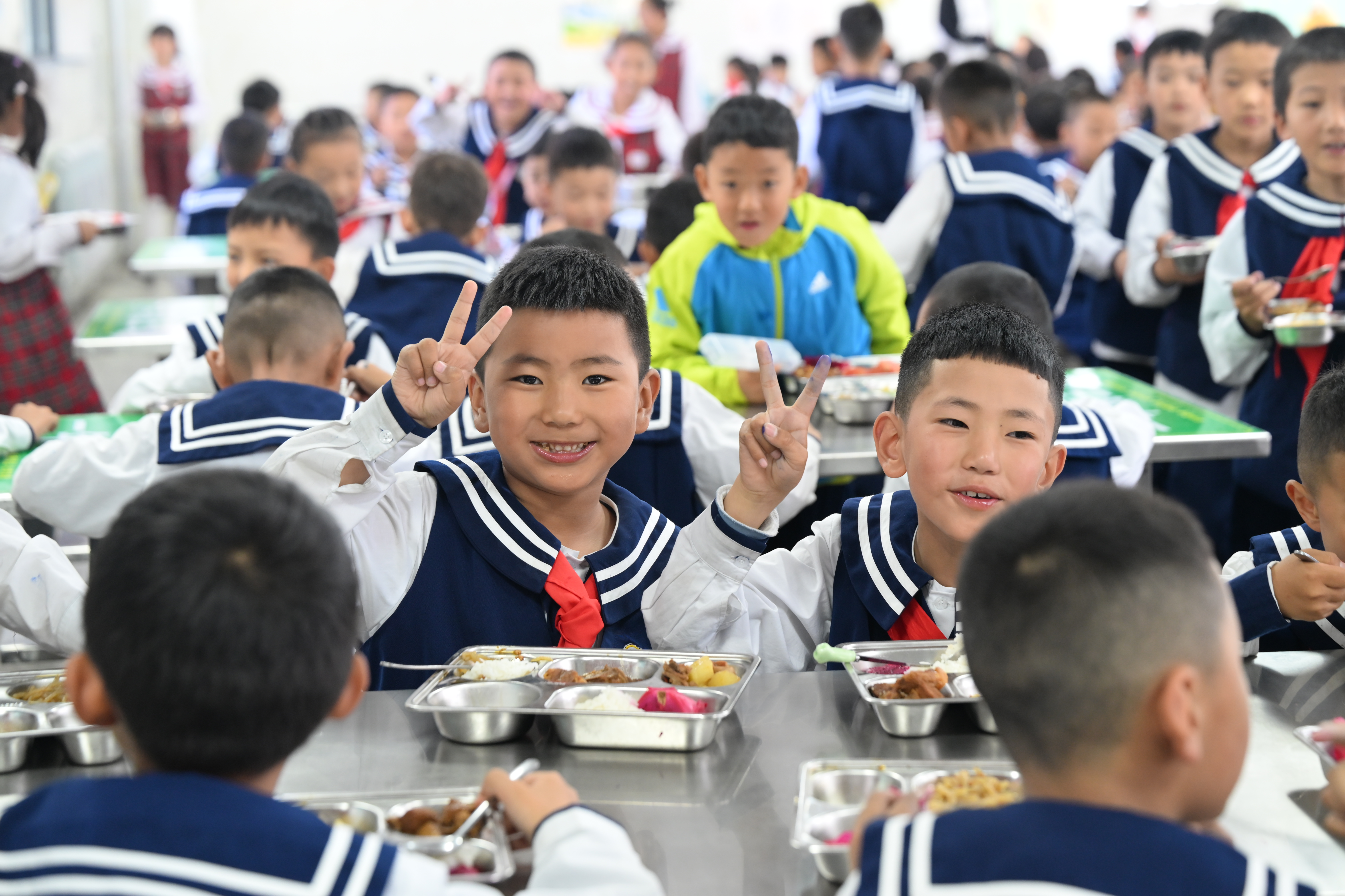 12時30分,在老師的引導下,一年級學生有序排成長隊依次打飯,然后坐到指定的區域內就餐。食堂工作人員一一為學生盛湯、分發水果,孩子們吃得津津有味。“特別喜歡學校里的午飯,我覺得比家里的飯還要好吃。”學生丹巴次仁說。