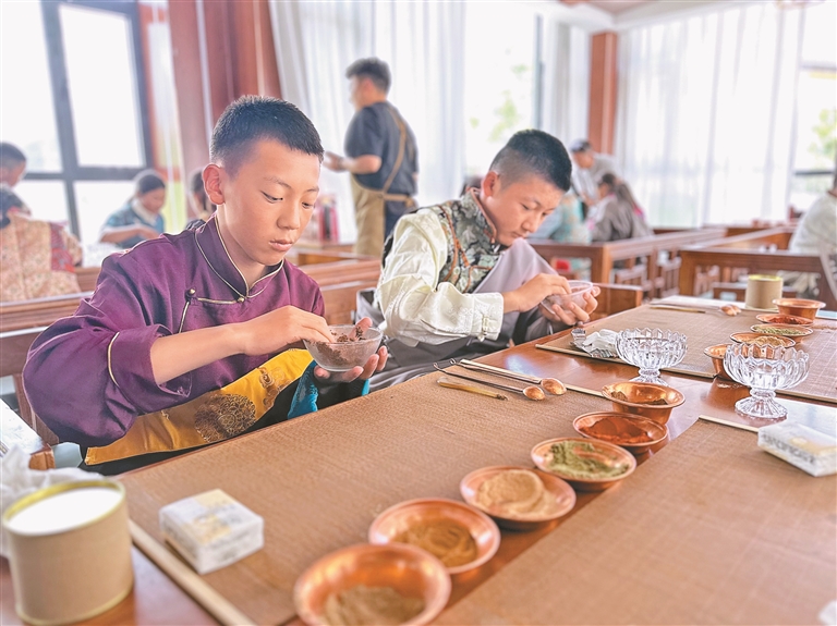 在實踐環節,孩子們圍坐在桌前,按照老師的指導,從研磨藥材開始,用石臼將各種原料搗碎、研磨成細膩的粉末;攪拌原料時,仔細按照比例調配,充分混合各種香料,力求調出最純正的香味。