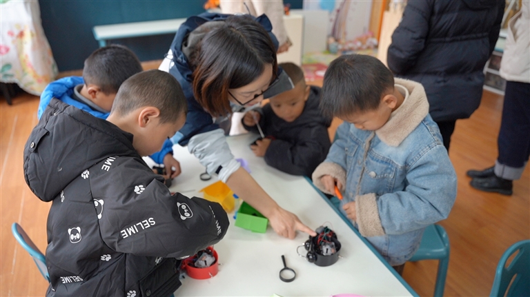 老師正在指導孩子們拆解玩具零件。記者 次仁旺姆 攝