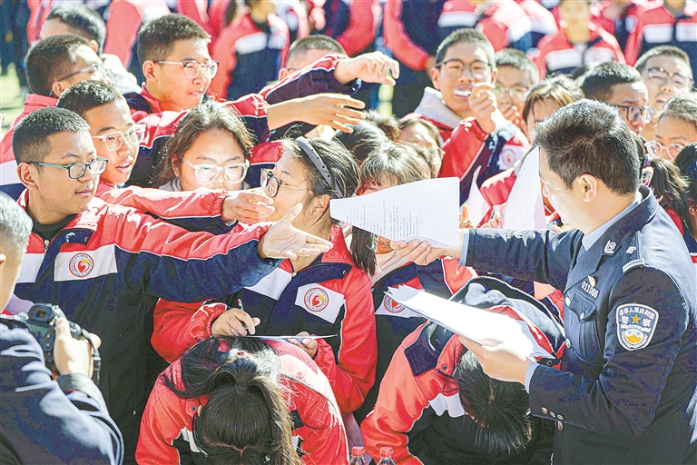 圖為我區“開學第一課”網絡普法進校園活動中,民警為學生發放普法宣傳知識手冊(資料圖片)。本報記者 貢曲羅杰 攝