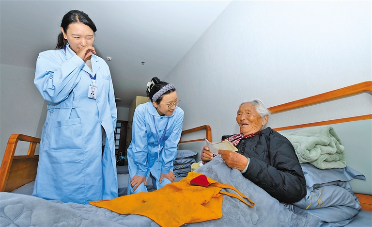 今年9月5日,拉薩市城關區老年人日間照料中心正式揭牌成立,為入住老人提供生活護理、健康餐飲、娛樂活動、心理疏導等各項服務,創造更加健康和諧的養老環境。圖為拉薩市城關區老年人日間照料中心的護理人員在陪老年人聊天。 本網記者 唐斌 攝