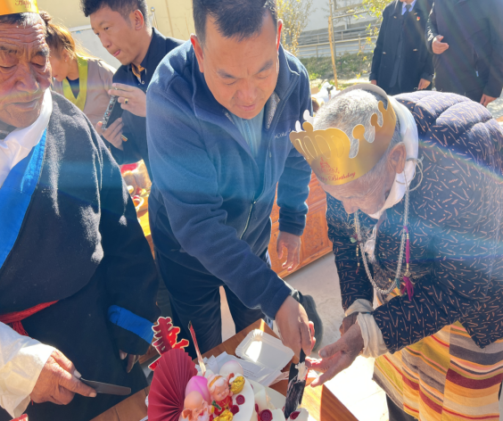 (圖為:縣委副書(shū)記、政府縣長(zhǎng)達(dá)娃平措與老人們切蛋糕現(xiàn)場(chǎng))