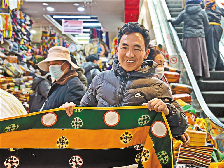 圖為拉薩市八廓商城內(nèi),攤位老板正量裁香布。本報(bào)記者 鹿麗娟 攝
