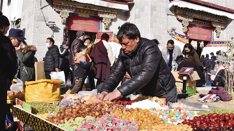 春節(jié)、藏歷新年臨近,置辦年貨是市民群眾過年前必不可少的一件大事。羅薩梅朵、卡賽、酥油花、切瑪盒……走在拉薩的大街小巷,本地特色年貨琳瑯滿目。這段時間,不僅本地居民忙著采購年貨,很多游客也穿梭在各大年貨市場,了解特色年貨的制作、用途和寓意,古城拉薩人頭攢動、紅紅火火,一片熱鬧非凡的景象。