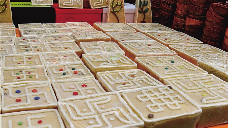 此外,“隆果”“卡賽”“羅薩梅朵”也是我區(qū)群眾過新年必不可少的年貨。“隆果”是一種用陶瓷、石膏等不同材質(zhì)制作的“彩塑羊頭”,根據(jù)大小、材質(zhì)的不同,售價從45元到上百元不等;“卡賽”是藏式油炸面果子,從最初的單一麻花款式,到如今款式和品種越來越豐富,是節(jié)日期間必備的美食之一;“羅薩梅朵”是經(jīng)過染色的麥穗花卉,一捆5元,過年時插到盛滿糌粑和青稞的切瑪盒上,寓意著新的一年是美滿、豐收的幸福年。