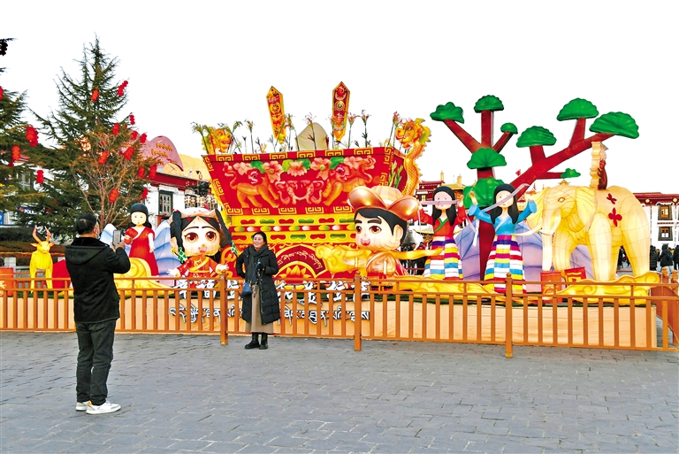 圖為拉薩大昭寺廣場新年主題裝飾前,市民拍照留念。 本網記者 旦增蘭澤 攝