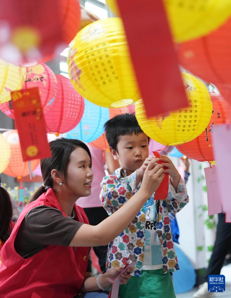 9月26日,在重慶市北碚區澄江鎮新時代文明實踐站,志愿者和小朋友一起猜燈謎。新華社發(秦廷富攝)