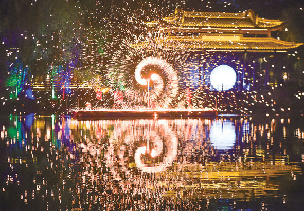 ▲9月29日,民間藝人在江蘇省鎮江句容市寶華山國家森林公園表演打鐵花,歡度佳節。新華社發(鐘學滿攝)