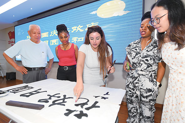 ▲9月28日,在柯橋大渡社區,一名來自突尼斯的客商(中)在社區活動中學習書法。近日,浙江省紹興市柯橋區組織多彩活動,邀請在此經商創業的少數民族同胞和外商共慶佳節。 新華社記者翁忻旸攝