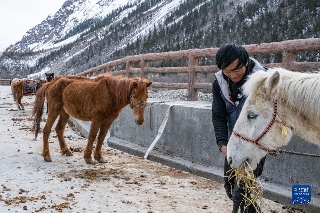 村民在林芝市波密縣境內(nèi)的米堆冰川腳下喂馬(4月23日攝)。新華社記者 孫非 攝