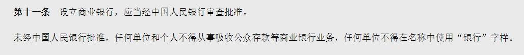 實(shí)際上,根據(jù)我國(guó)《商業(yè)銀行法》第十一條規(guī)定,設(shè)立商業(yè)銀行,應(yīng)當(dāng)經(jīng)國(guó)務(wù)院銀行業(yè)監(jiān)督管理機(jī)構(gòu)審查批準(zhǔn)。未經(jīng)國(guó)務(wù)院銀行業(yè)監(jiān)督管理機(jī)構(gòu)批準(zhǔn),任何單位和個(gè)人不得從事吸收公眾存款等商業(yè)銀行業(yè)務(wù),任何單位不得在名稱中使用“銀行”字樣。