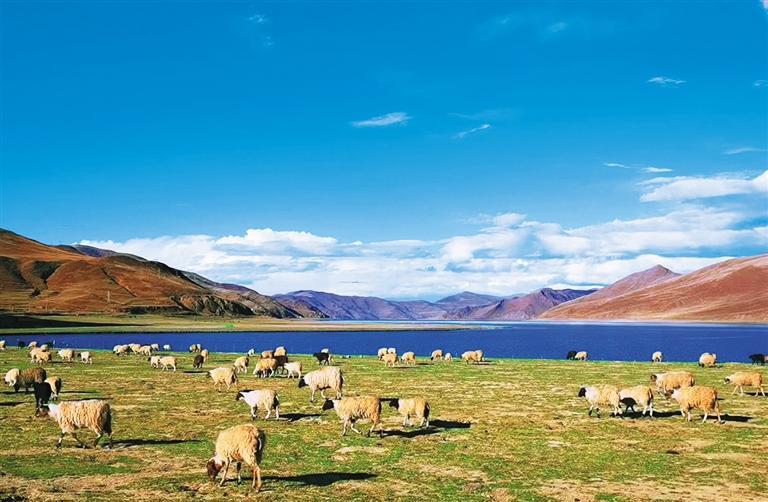 山南市浪卡子縣羊卓雍措湖畔,羊群在悠閑地吃草。山南推動農牧業健康發展,持續增加農牧民收入。經濟日報記者 代 玲攝