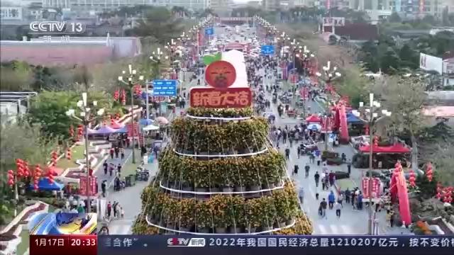 在花市的中心廣場上,矗立著一座由1138盆年橘樹堆砌而成的年橘塔,塔高16.8米,共有16層,很多游客拍照留念。