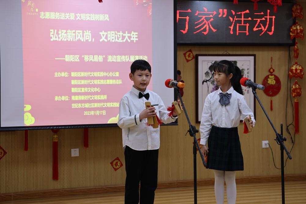 圖為兩位小學生在“黨的聲音進萬家 弘揚新風尚,文明過大年”專場展演活動中表演原創快板《綠色環保譜新篇》。 北京市朝陽區宣傳文化中心供圖