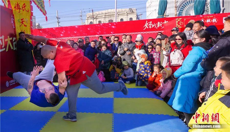 2018年春節(jié),北京廠甸廟會(huì)的傳統(tǒng)摔跤表演。賈天勇 攝