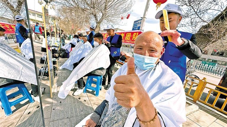在拉薩市開展的“ 民族團結一家 巧手剪出民族情”愛心義剪志愿服務活動中,理發師們為各族群眾理發。