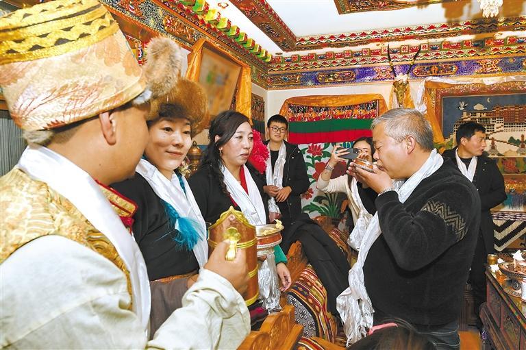 游客們在拉薩市城關區奪底街道維巴村體驗藏歷新年的別樣風俗。