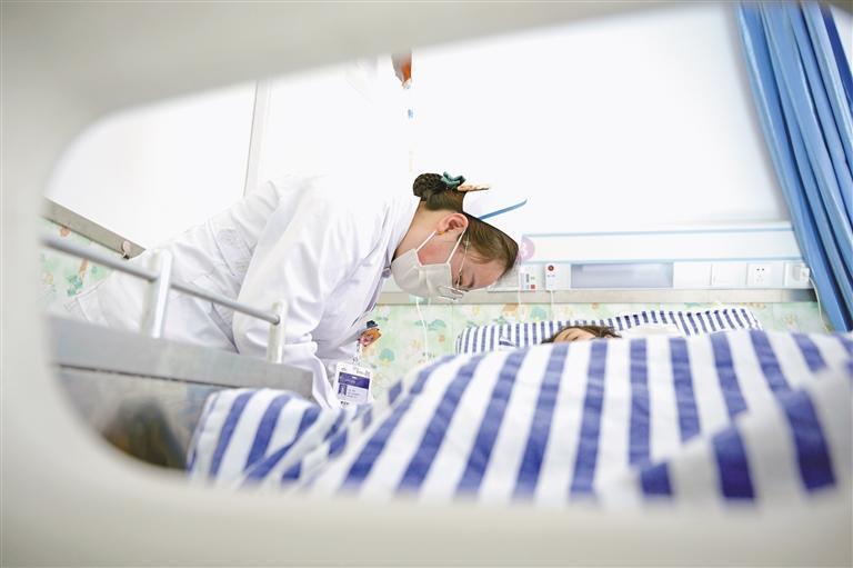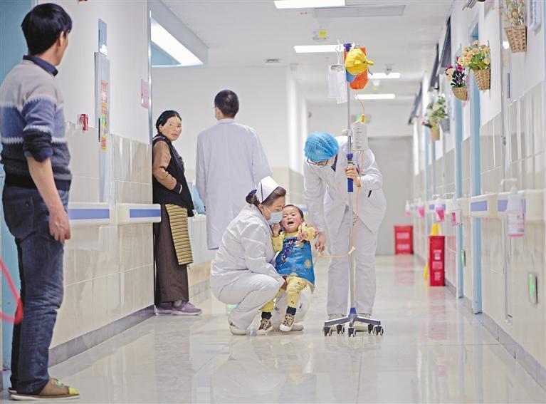 在拉薩市人民醫(yī)院,安撫患兒情緒的醫(yī)護(hù)人員。記者 潘多 攝
