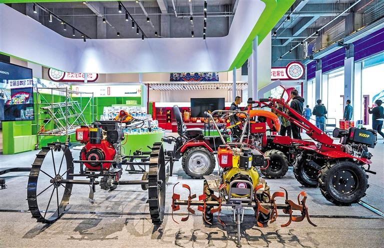 圖為高原特色農(nóng)牧業(yè)產(chǎn)品展位展出的農(nóng)用機(jī)械。記者 貢曲羅杰 攝