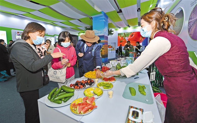 觀展者現場品嘗特色農產品。