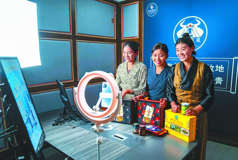 圖為網(wǎng)絡(luò)主播在巴青縣“赤堆東雄”網(wǎng)紅直播間推介當(dāng)?shù)靥厣r(nóng)牧產(chǎn)品。新華社記者 孫非 攝