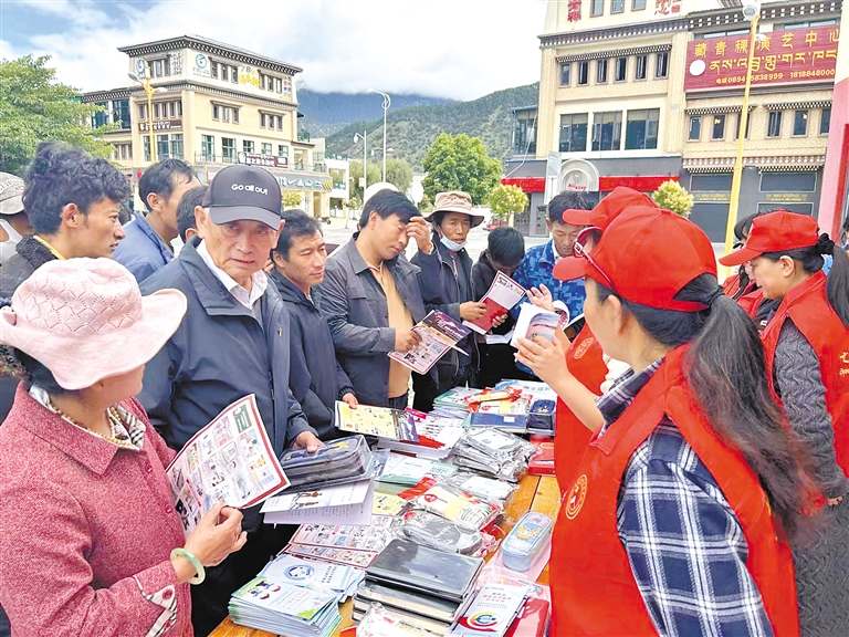 巴宜區覺木街道志愿服務隊向過往群眾發放防范網絡詐騙、普及消防安全知識等內容的宣傳冊。