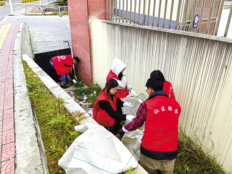 巴宜區覺木街道志愿服務隊在社區內撿拾垃圾、保護環境。