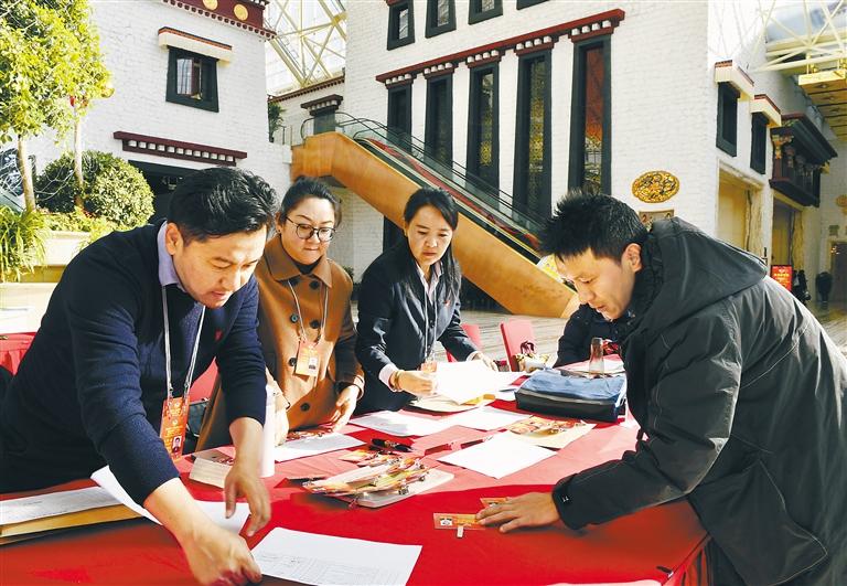 圖為參加自治區(qū)兩會的政協(xié)委員在駐地領(lǐng)取證件和會議資料。記者 旦增蘭澤 攝