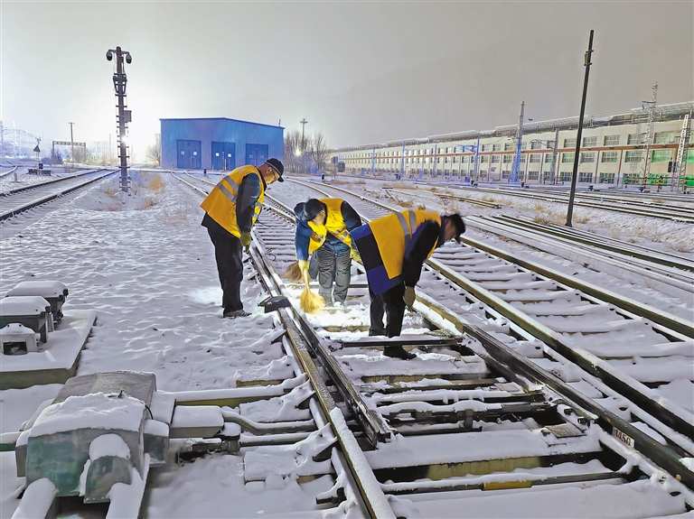 圖為職工在清掃車間道岔內的積雪。記者 張宇 通訊員 魏雪平 攝