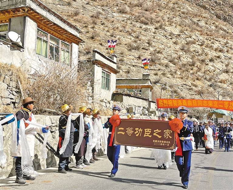 圖為鑼鼓喧天、熱鬧喜慶的氛圍中,洛桑曲旦身著火焰藍、胸佩大紅花,其家屬佩戴“一人立功 全家光榮”綬帶,“送獎報喜團”抬著“二等功臣之家”牌匾,拉著“熱烈祝賀洛桑曲旦同志榮立二等功”橫幅闊步前往洛桑曲旦位于山南市桑日縣增期鄉達古村的家中。記者 劉琳琳 攝