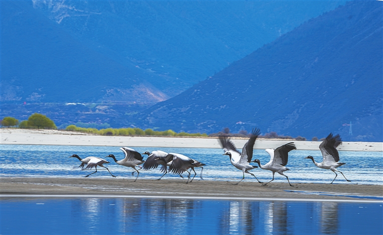 圖為黑頸鶴抖動雙翅起飛。通訊員 普布次仁 記者 盧文靜 攝