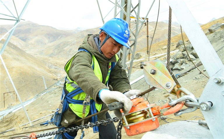 拉薩市尼木縣新能源110千伏送出工程的工作人員正在組立鐵塔。本報記者 格桑倫珠 攝