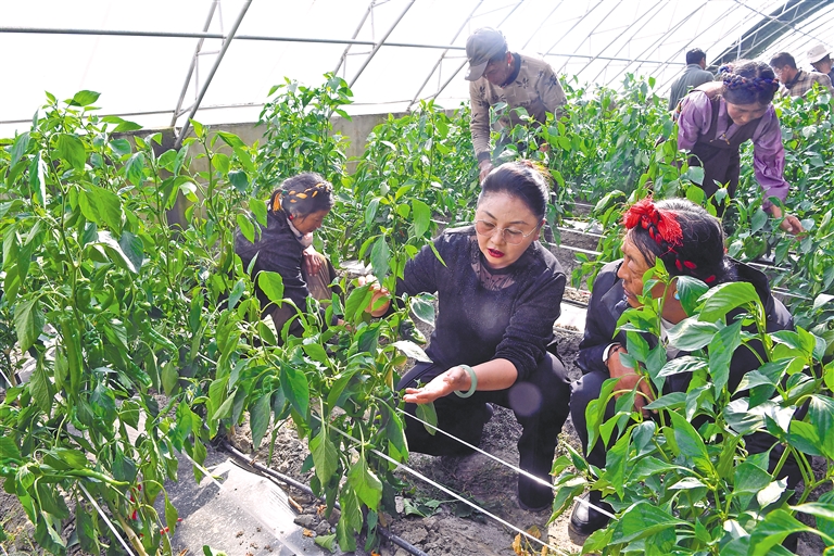 圖為自治區(qū)農科院蔬菜研究所專家劉玉紅(中)向拉孜鎮(zhèn)蔬菜種植戶開展技術指導。本網記者 洛桑 攝