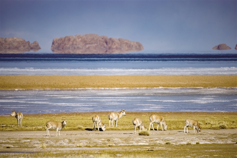 色林措邊的藏羚羊。 新華社記者 姜帆 攝